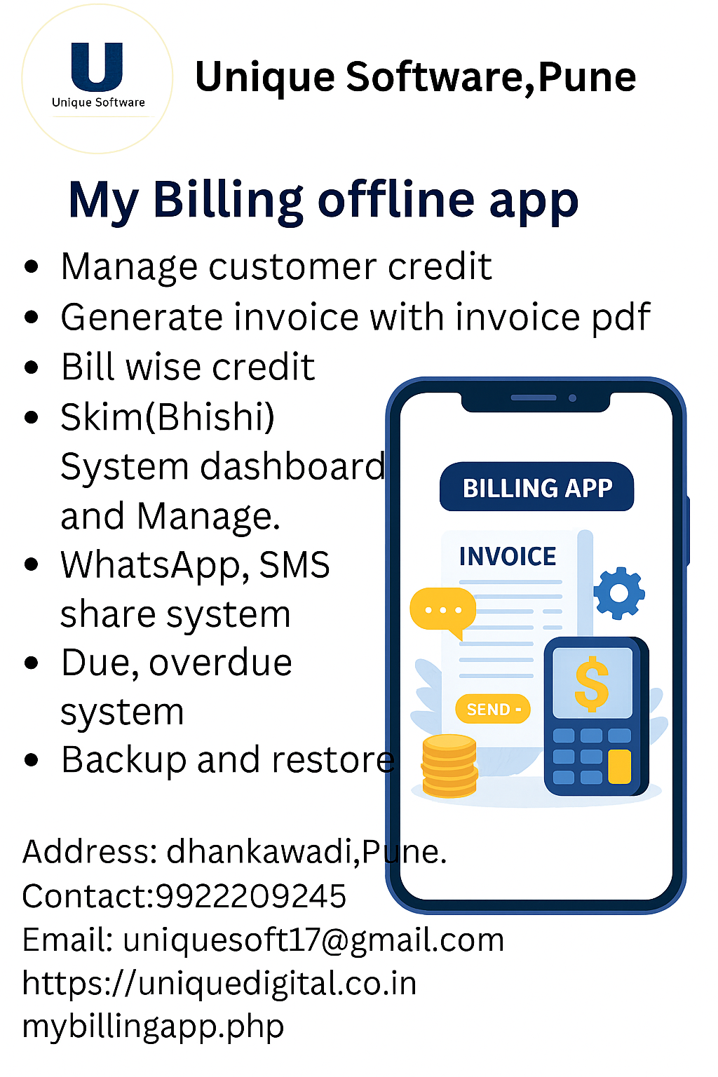 Unique Software,Pune - SMS App and Digital Website - My Billing Offline App - Smart Jewellery App - Advance Jewellery Software - Milk Dairy Software. - E - Commerse site